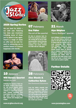 The founder of Jazz at St Giles, our lovely friend and Musical Inspiration, Jean Darke, passed from us on March 4 2021 after a short illness. Our Spring 2026 Series 14 will celebrate Jean’s life as a musician, and especially her enduring legacy to us which was the love of jazz which she shared so generously with us all through creating our JASG series. We are still going strong!